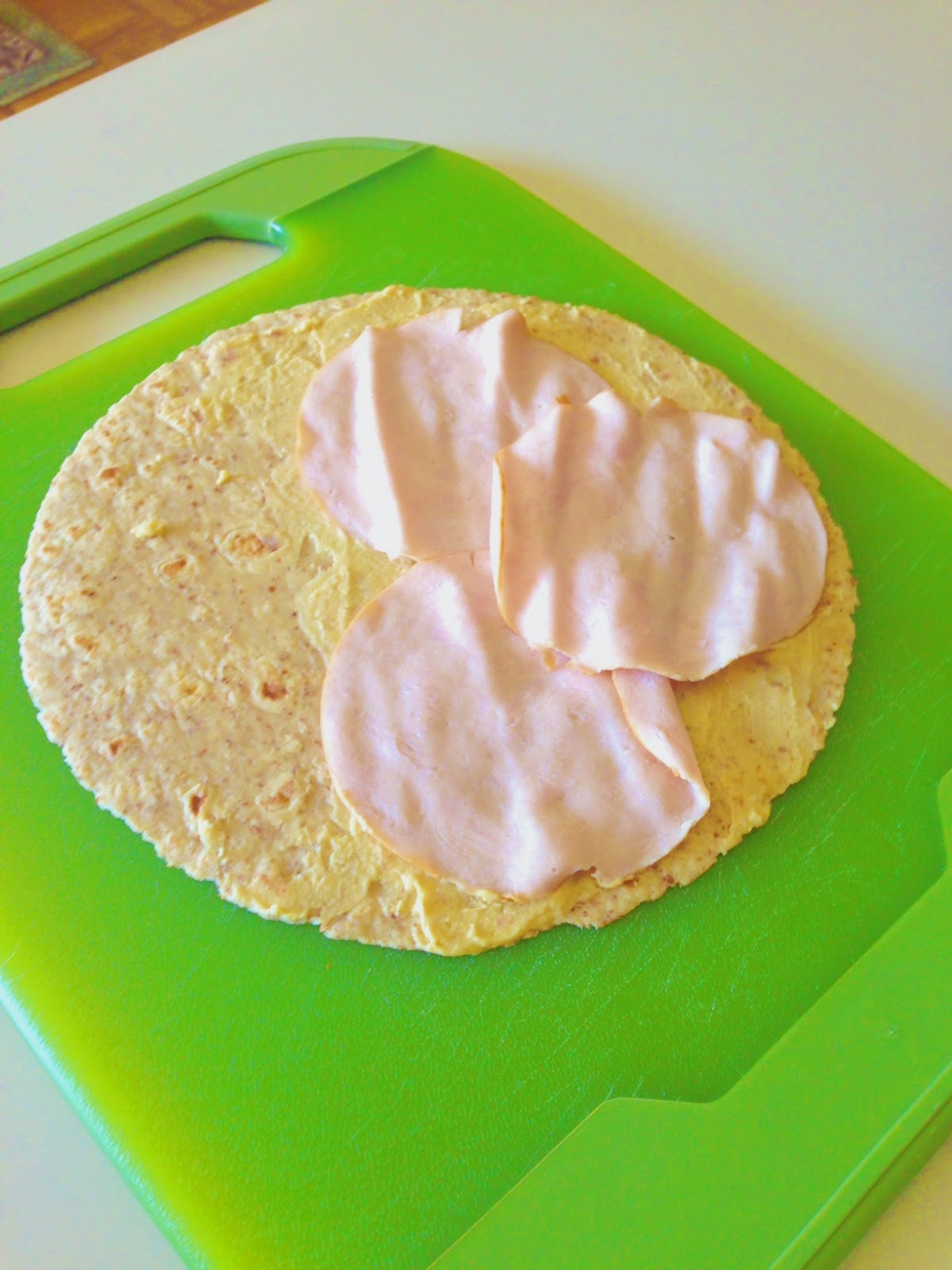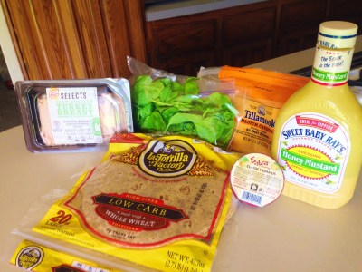 Spread hummus on tortilla, Top with turkey, then cheese and honey mustard and top with spinach. Roll it up and cut in half. serve with a side of fruit. Enjoy.
