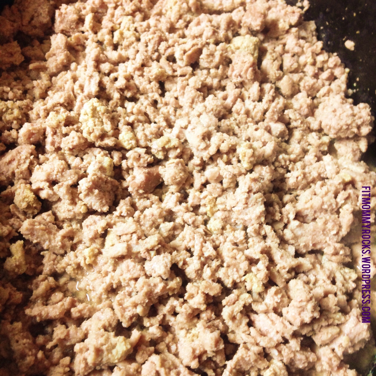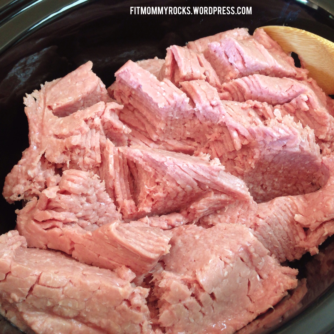 First off, if I haven’t found a good deal on ground meat I grab my meat from Costco. I like to use ground turkey and I use it in place of beef in most of my meals. Costco sells their ground turkey in 4 packs of about 1.25 lbs. When I get home from shopping I put all the ground meat in the slow cooker that has been sprayed. I use a canola oil cooking spray. Then I put all the meat in the slow cooker. I break it up using a spatula.
