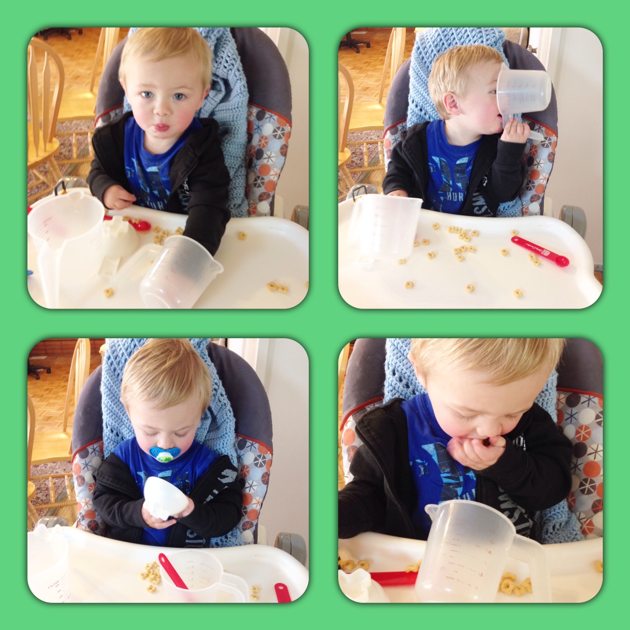 - Let them play with measuring cups and put crackers or cheerios in them— show them how to dump them into other cups.