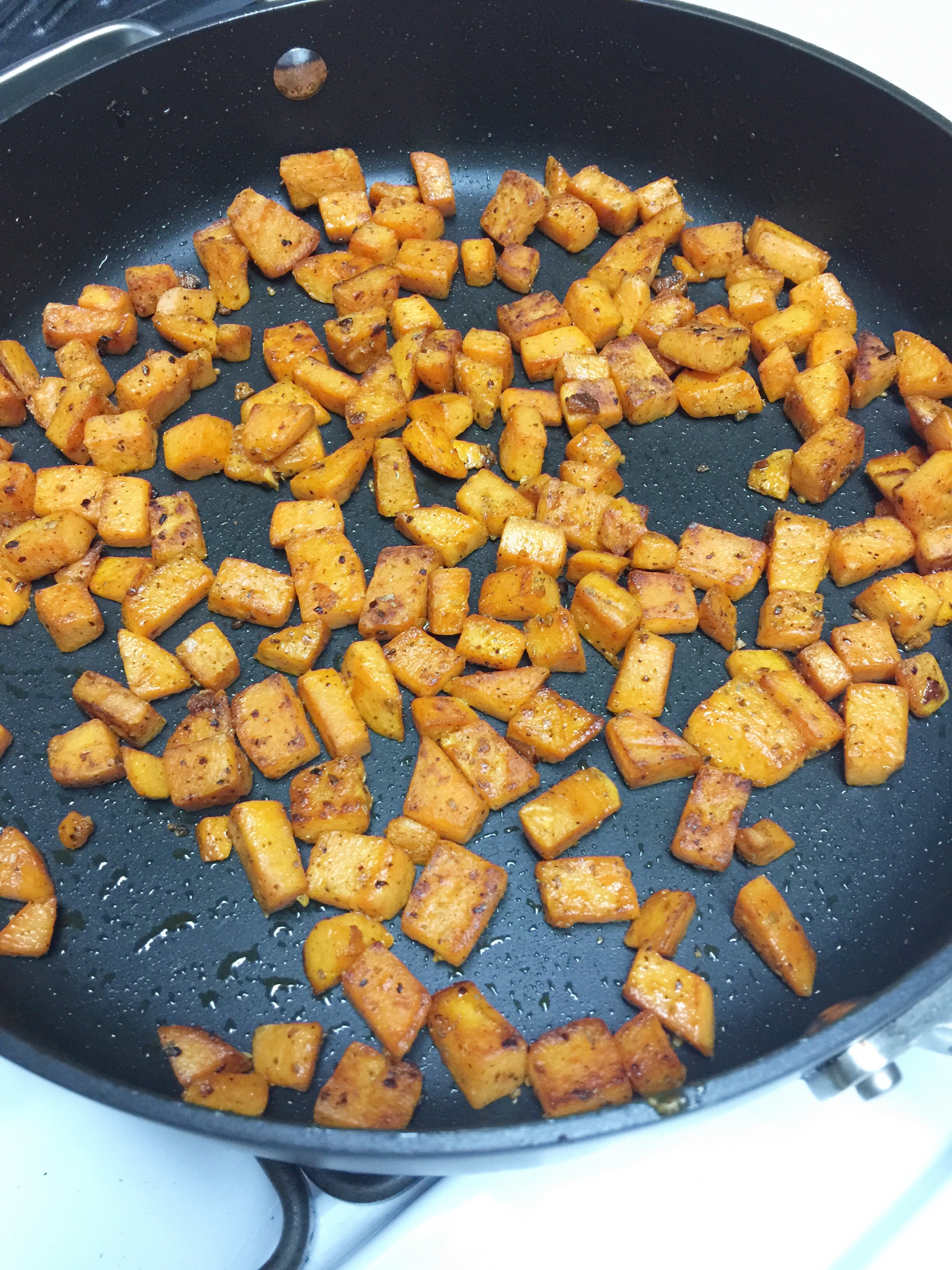 I start by drizzling some olive oil in a skillet and add my diced sweet potato.