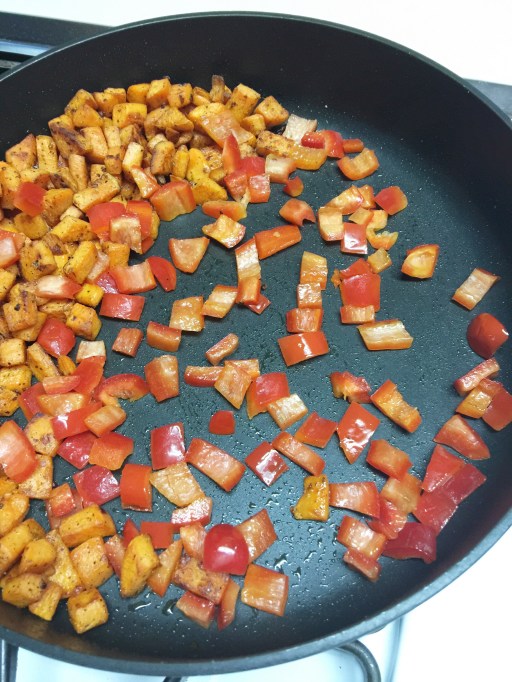 When Sweet Potato is tender, push to the side and add bell pepper. Just bring to a sweat then push to the side.