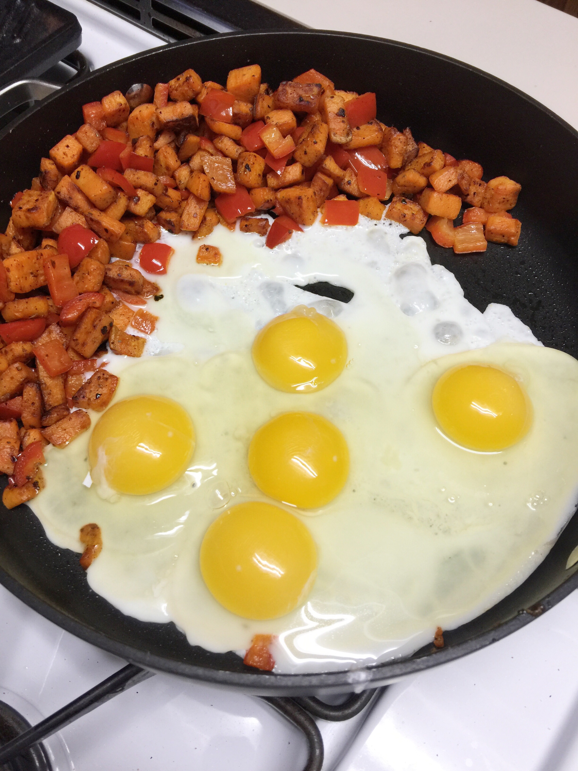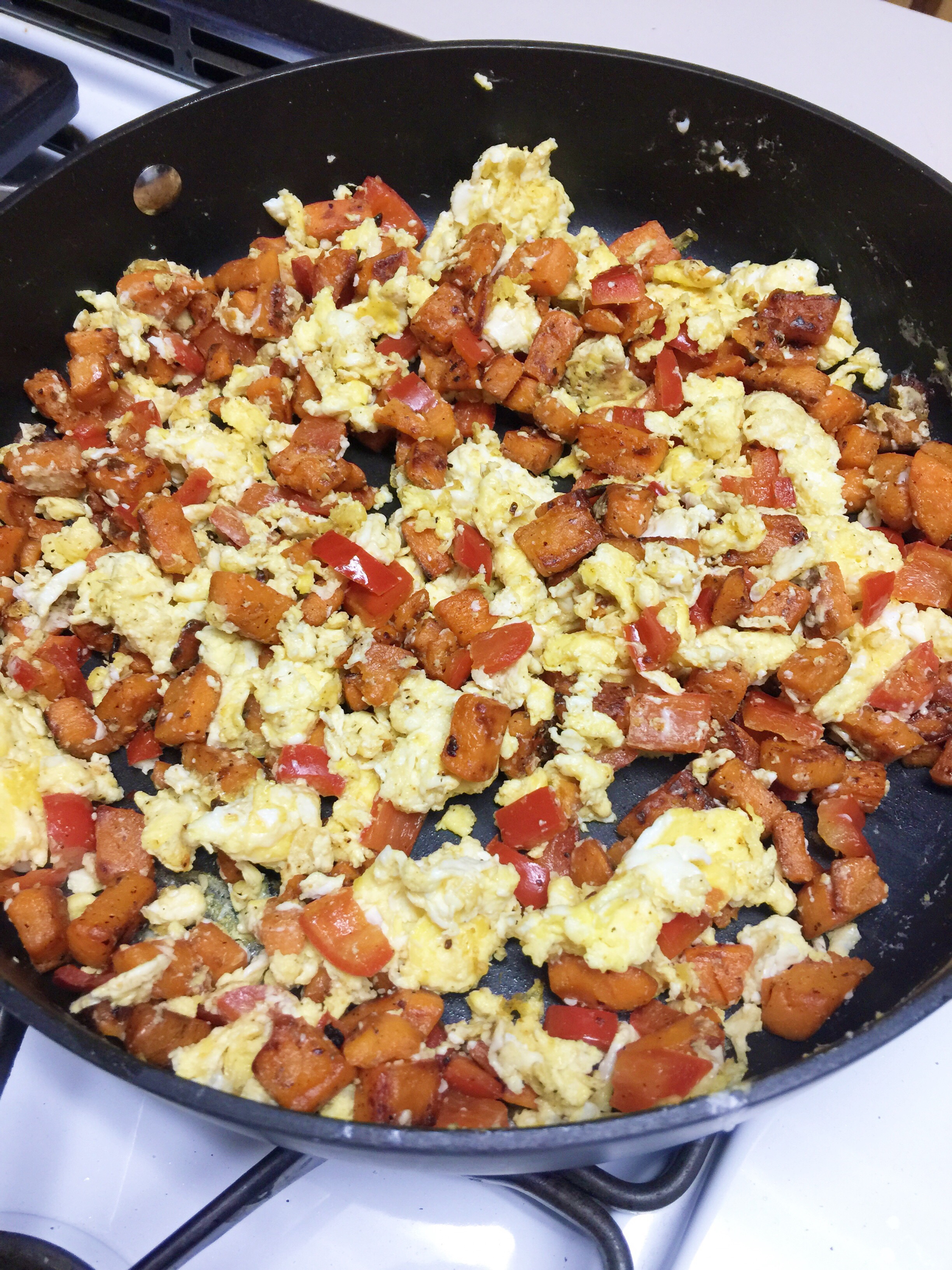 Once eggs are cooked mix sweet potato, pepper and eggs all together.