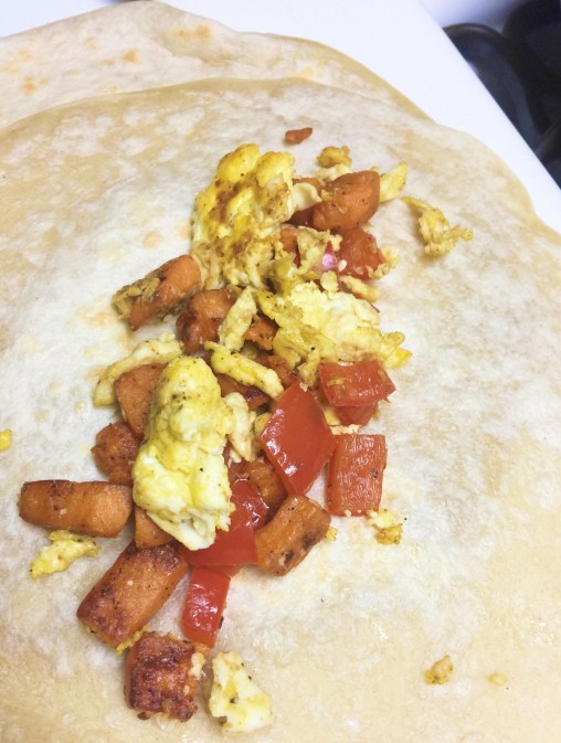 I would have to say one of my favorite foods is a good breakfast burrito! I just love them! I gotta say that this one is one of the best!! The sweet potato and the sweet bell pepper work SO well together!