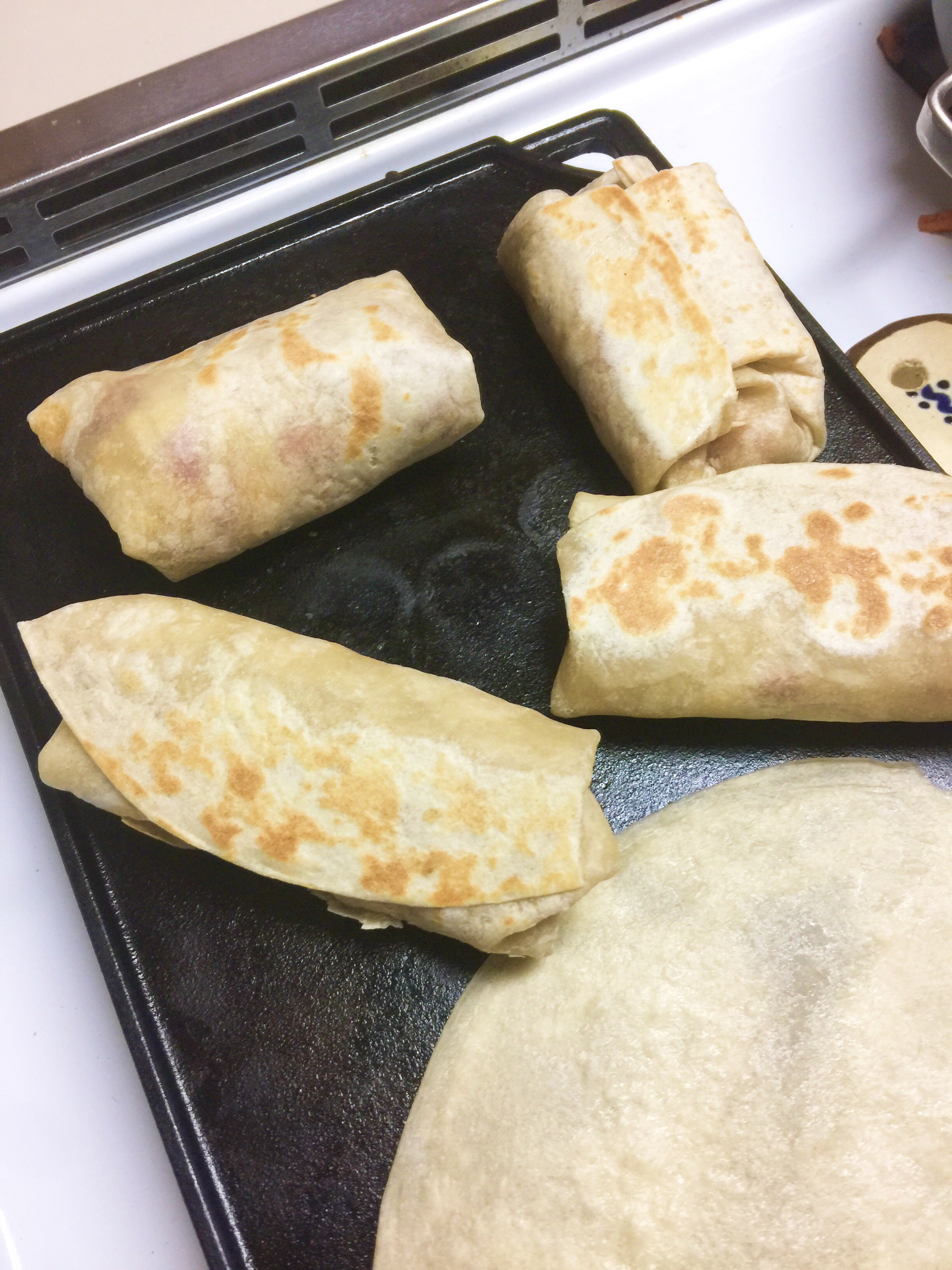 Cook tortillas, then add the filling, roll up and place back on the skillet to brown.