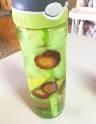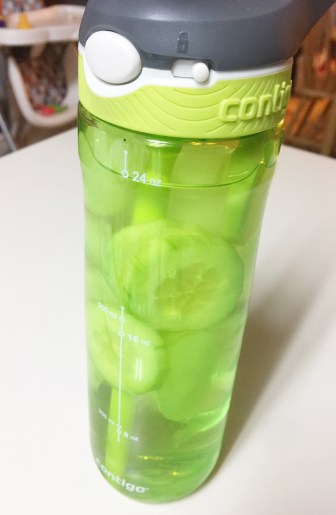 Cucumber in water is amazing! My husband thought I was so weird for putting cucumbers in my water, but I finally got him to taste it and he was surprised how tasty it is! (This is my “cute” green water bottle that I love and take EVERYWHERE with me)
